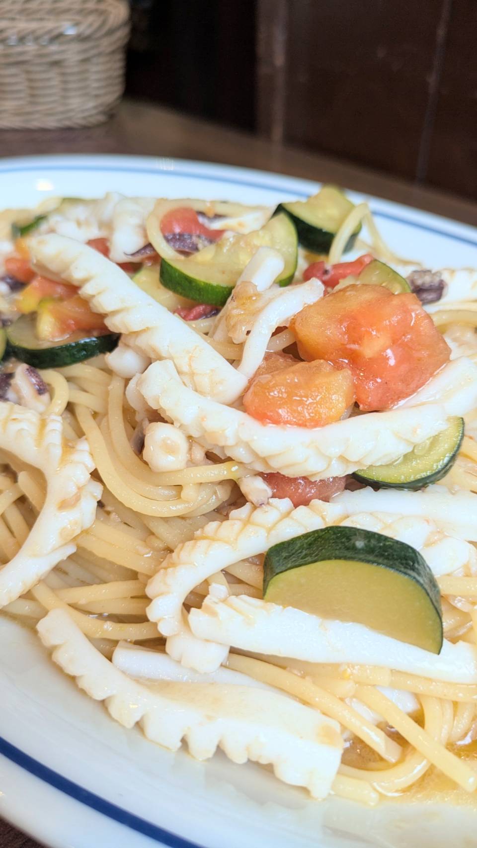 ニンニクの香りが食欲を誘うペペロンチーノに、フレッシュトマトの旨味が溶け出した逸品。仕上げにサッと火を入れた、柔らかいアオリイカと合わせた一皿です🤤🤤❤️